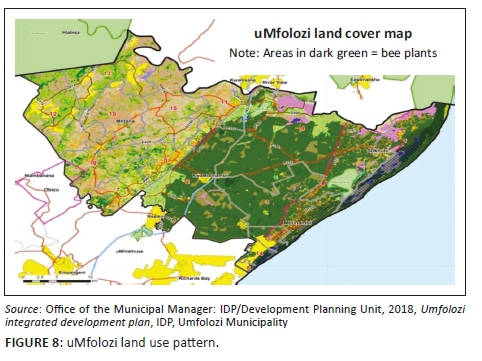 The uMfolozi local municipality is predominantly rural, as it consists of an impoverished population which depends on traditional forms of living such as subsistence farming, the burning of fossil fuels, sugarcane farming and timber farming to make ends meet. There are very few jobs and, as industries become more and more mechanised, less opportunities force the youth to travel to other areas in search of employment. The researcher chose uMfolozi as an area to develop his beekeeper-based micro-franchise model for integral mission of which poverty alleviation would be a vital aspect because of the vast areas of honey producing Eucalyptus plantations that are grown both commercially and on a small scale by community members in the area - illustrated in Figures 6, 7 and 8 as the dark green areas. This enables families to farm their bees in the safety of their yards, while there is enough bee food (carrying capacity) for beekeeping to be viable.