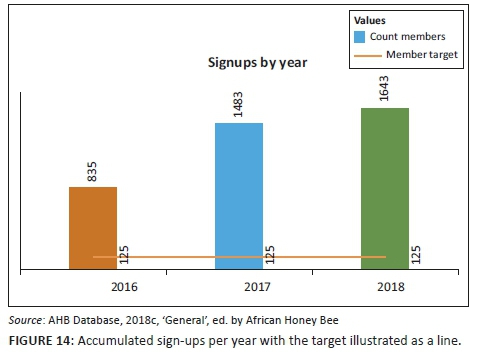 Once a participant had completed making their own beekeeping equipment (demonstrating commitment), they get signed up as a member of the project. The target in 2016 was for 125 beekeepers. Figure 14 illustrates the accumulated number of sign-ups verses the flatline target of 125.