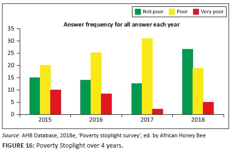 It is interesting to look at an overall Poverty Stoplight survey of the whole project from 2015 until 2018 to see the changes in perceptions in poverty. Figure 16 shows 'very poor' coming down for 3 years and then going up slightly. 'Not poor' also goes down slightly and then in 2018 goes up significantly. 'Poor' shows a steady increase and then decrease in 2018 when it is replaced by 'not poor'.