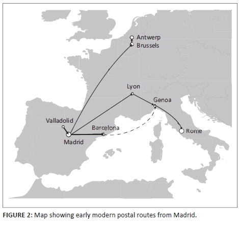 In the first place, the evidence suggests that Persons and Acquaviva wrote to each other about once a month. Since letters took anything from 4 to 6 weeks to be carried between Spain and Italy by the ordinary courier (Schobesberger et al. 2016; see Figure 2), this meant that the letters normally crossed: Acquaviva's replies are usually dated about 6 weeks after the letter to which he was responding, and Persons would have written another in between. Thus it is impossible to read the letters in a simple sequence of exchange, and this presents a challenge to the editor wishing to give an accurate representation. The record for 1591 is also particularly patchy, with far fewer letters from Acquaviva and thus less evidence of letters from Persons. During much of this year, Persons was operating near Seville, spending some time in Puerto de Santa Maria and San Lucar de Barrameda, up the coast from Cadiz, further away from the main lines of communication.