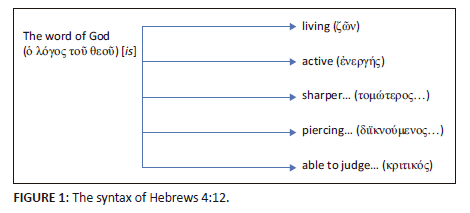 Hebrews 4:12-13 functions as the conclusion of this midrash, linked to the previous with the conjunction 'for' (γάρ). These verses form a long periodic sentence (Blass & Debrunner 1961:242 [§464]; cf. Heb 1:1-4; 2:2-4; 3:12-15). Hebrews 4:12 centres around the subject 'the word of God' (ὁ λόγος τοῦ θεοῦ), one of the only two occurrences of the phrase in Hebrews (cf. Heb 13:7). Syntactically, Hebrews 4:12 describes 'the word of God' by means of five predicative complements,2 which can be seen in Figure 1.