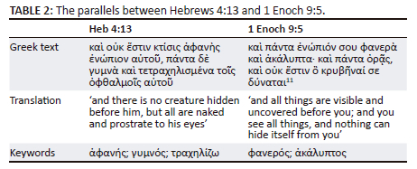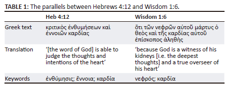 In my view, by distinguishing between the motifs of (1) the scrutiny of God or his word to discern the thoughts or intentions of the human heart (Heb 4:12), and (2) the transparency of all things in God's sight (Heb 4:13), the greatest parallels that surface between Hebrews 4:12-13 and the Old Testament and its extant literature found in the LXX are Wisdom 1:6 and 1 Enoch 9:5. Hebrews 4:12 and Wisdom 1:6 contain the strongest parallel to the first motif, while Hebrews 4:13 and 1 Enoch 9:5 contain the strongest parallel to the second motif. An overview of these parallels can be seen in Table 1 and Table 2, respectively11.