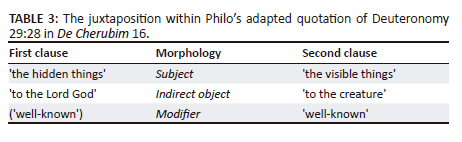 There are clear differences between the quoted words in Philo and the LXX. In the first clause Philo does not refer to the Lord as our (ἡμῶν) God. More strikingly, however, is the second clause which begins similarly to the LXX with 'the visible things' (τὰ δὲ φανερὰ) but is then replaced in its entirety by the phrase 'well-known to the creature' (γενέσει γνώριμα). This change in formulation leads to a juxtaposing of divine and human knowledge in Deuteronomy 29:28: visible things are well-known to human beings; hidden things, per implication, are well-known to God. This juxtaposing is illustrated in Table 3.