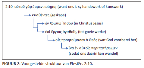 In vers 10 staan die woord αὐτοῦ, wat na God verwys, voorop. Paulus beklemtoon dus God as die handelende persoon in aansluiting by die vorige verse. Die gelowiges word beskryf as God se handewerk of kunswerk. Die woord κτισθέντες [geskep] verklaar die handewerk as ʼn skeppingsdaad. Die skeppingsdaad word verder verklaar deur twee sinne. Dit is gedoen in Christus Jesus en die doel van die skeppingswerk is, dat dit tot goeie werke sal lei (sien Figuur 2). Die goeie werke word nader bepaal deur die feit dat God dit vooraf berei het, voorbeskik of gereed gemaak het. Die doel waarom Hy dit voorberei het, is dat die gelowiges daarin sal wandel. Hier is dus sprake van ʼn nuwe identiteit (God se nuutskepping) en ʼn nuwe lewensdoel (wandel in God se voorbeskikte goeie werke).