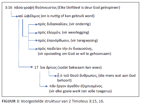 In vers 16 en 17 word die aard van die Skrif beskryf, waarvoor dit gebruik kan word, en die einddoel van die gebruik van die Skrif (sien Figuur 3). Dit beskryf ook die wyse waarop die Skrif die gelowige kan wys maak tot die verlossing in Christus, met die veronderstelling dat dit deur Paulus se lewe geïllustreer word asook in Timoteus se lewe, in navolging van Paulus. Die struktuur van vers 16 en 17 kan soos volg voorgestel word: vers 17 begin met die woord ἵνα, waarmee ʼn beskrywing van die doel van die gebruik van die Skrif ingelei word, naamlik om die mens wat aan God behoort, te bekwaam, en vir elke goeie werk ten volle toegerus te wees. Hierdie bekwaammaking vind in die nouste verhouding (ὁτοῦΘεοῦἄνθρωπος) met God plaas. Om die betekenis van hierdie doel te begryp, is dit nodig dat die verskillende fasette van die toerusting waarvoor die Skrif gebruik kan word (v. 16), nader ondersoek word.