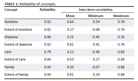 The descriptive statistics revealed that participants understood the concepts of koinōnia, diakonia, care and family and they experienced these concepts within their church congregations. There is, however, a practical visible difference between the church members' understanding of the concept of diakonia and that of pastoral counsellors, pastors and ministers. Similarly, the understanding and the experience of care for church members moderately differed from the results of pastors and ministers.