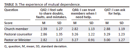 The same comparison was made with the variable of 'mutual dependence' (see Table 3). Participants indicated a lack of experiencing mutual dependence upon one another, as they did not feel safe to share their concerns (Question 42; M = 2.7; SD = 1.3), did not trust one another when they needed help (Question 46; M = 3.1; SD = 1.2) and did not feel that they could ask for help from their fellow members (Question 47; M = 3.1; SD = 1.2). Table 3 confirmed that church members were the least likely to have confidence to depend on fellow members of the congregation.