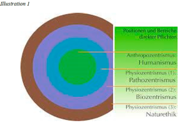 In Germany, Klaus Michael Meyer-Abich has emphatically developed the concept of an "intrinsic value of the natural environment" (Meyer-Abich 1989:254) that goes beyond human interests and needs. Starting from the connectedness of human beings with their natural environment, he emphasises "what is common to human beings and all other living beings, animals and plants, as well as the elements, the communion in which they equally stand" (Meyer-Abich 1989:258). On the basis of this natural interconnectedness, he develops a gradual model of ethics that ultimately includes the entire ecosphere (cf. Illustration 1).