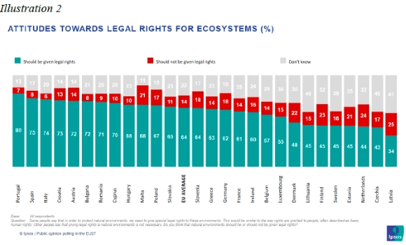 Again, the question of the rights of plants or the natural elements remains unsolved. Nevertheless, two countries have established a legal status for non-human beings, not only for animals: Ecuador in 2008 and Spain in 2022. After a dramatic ecological situation in the lagoon Mar Menor in Spain, the lagoon became the first ecosystem in Europe with a legal status. Any Spanish citizen can file a lawsuit in court to protect the lagoon. The German jurist Jens Kersten argues that "only those who can complain later (or for whom it is possible to complain) will be heard in political decision-making" (cf. Kersten 2014). So, a legal status for non-human beings and even the ecosphere is an instrument of importance that must be developed. Most of the citizens of the EU support this idea (cf. Illustration 2). At the very least, a reversal of the burden of presenting evidence in court is needed: it is not protecting nature that needs to be justified, every kind of damage to nature should be held accountable.