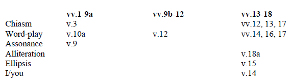 To understand a poem well, the poetic and rhetorical features are helpful, indicating the divisions and the peak (or high-point) which reveals the main message. In the next sections, some of these literary elements are discussed with a view towards how they help interpret the main point of the poem.