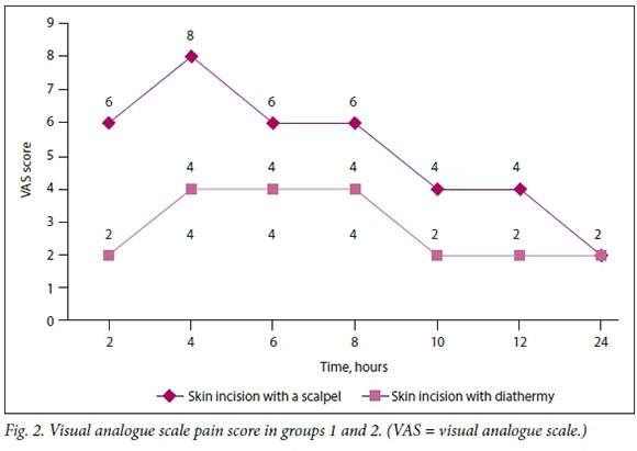 RESULTS. The incision time, blood loss, visual analogue scale (VAS) pain score and doses needed for analgesia were significantly lower in group 2 than in group 1 (p<0.001). The groups did not show any significant difference regarding wound complications. Wound healing in both groups was by primary intention.