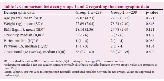 Following the CONSORT (Consolidated Standards of Reporting Trials) recommendations, we assessed 524 women who underwent elective CS. We excluded 48 women from the study: 5 declined to participate, while the remaining 43 did not meet the eligibility criteria (Fig. 1). Regarding the participants' baseline characteristics, their mean age was 29.31 (5.4) years and their mean BMI was 27.96 (2.8) kg/m2. According to the Pfannenstiel skin incision method, they were divided into two groups: group 1 (women who underwent skin incision with a scalpel) and group 2 (women who underwent skin incision with diathermy). When comparing the demographic data, the groups showed no significant difference regarding age, weight, BMI, gravidity, parity, history of previous CS and gestational age at delivery (Table 1).
