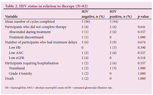 RESULTS: More than 90% of both HIV-positive and HIV-negative participants completed all 5 cycles of chemotherapy. The main finding in both cohorts was Grade 1 and 2 haematological toxicity. Haemoglobin was significantly decreased in 74% of participants. No renal toxicity was identified in this study. The reasons for not completing treatment were abscondment during treatment (3%) and discontinuation of treatment by the physician (1%