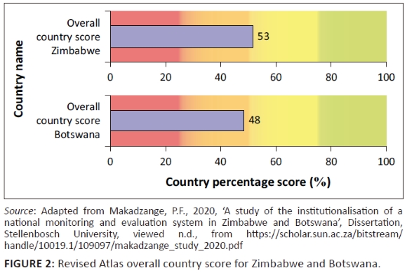 RESULTS: Overall, while Botswana received a score of 48% on the International Atlas of Evaluation scale, Zimbabwe got 53%. These scores indicate that the two countries have attained a rather average level of institutionalisation and are still lacking in terms of meeting the expected gold standards.