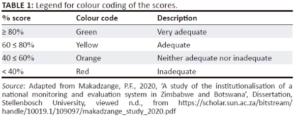 The data was downloaded from the SurveyMonkey system as an excel data set and then uploaded into the International Atlas of Evaluation Assessment tool. A code was then run in the tool to combine the respondents' scores into an aggregate rating. The tool contained 12 domains with two to three dimensions under each domain. For each dimension, a range of possible scenarios was provided allowing for objective and quantitative rating. The highest score given for a fully institutionalised scenario considered 'highly adequate' was 4. The lowest score depicting an un-institutionalised scenario was 0 thus when the situation is regarded as 'not adequate' at all in terms of meeting the institutionalisation gold standard. Therefore, for each dimension a sum score was calculated by adding up scores from each respondent, and then dividing the total by the count to generate an average score. This average score was then compared against the maximum possible score to yield a percentage rating score. Table 1 presents the percentage rating scores and the corresponding legend for the colour code and description.