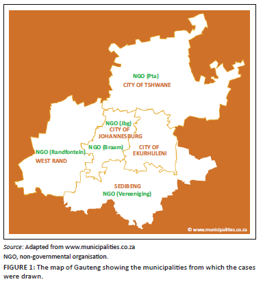 Negotiation of research access started with a telephone call to suitable NGOs identified from the CharitySA website, considering the different municipalities in the Gauteng province. At first, it was unclear whether the NGOs would be willing to participate in the research. From the list of eight suitable NGOs, which indicated a willingness to help, the researchers narrowed down to five based on how quickly they responded. The university ethics committee also required gatekeeper letters from the NGOs that authorised the researcher to interview their employees. Some gatekeeper letters arrived late after the researchers had submitted the five gatekeeper letters to the university ethics committee; hence, those that came late could not be part of the study. Figure 1 shows the diagrammatical representation of NGOs in the different municipalities of Gauteng that agreed to participate - one in the city of Tshwane (TS4) (Pretoria), one in Westrand (WR5) (Randfontein), one in Sedibeng (SD3) (Vereeniging), two in the City of Johannesburg - Braamfontein (JB1) and Johannesburg CBD (JC2).
