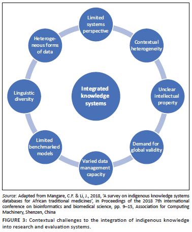 And finally, one of the biggest challenges to integrating indigenous knowledge systems into evaluation is that many systems of knowledge are virtually, by definition, difficult to access, simply because of their nature. As shown in Figure 3, the characteristics of indigenous knowledge remain the same whether this knowledge is mobilised for research or evaluation. This knowledge may exist in languages that are not often translated or do not exist in written form. They may be deeply embedded in a cultural context that has not been described in detail, and they may be held by communities and difficult to extract from their unique contexts. In fact, researchers who are not from the community may not even know what form the knowledge takes, whether it is through cultural rituals, oral histories, various forms of art, written archives, intergenerational lessons and more. Even if this is known, these diverse forms of knowledge vary in the ease of capture and translation into academic norms. These challenges are not insurmountable, and many of the studies provide strategies, tools and approaches for carrying out research despite these challenges. For example, '[t]he absence of documentation which seems to be regarded as a setback for perpetuation of IKS may be resolved through audio and video tapes' (Hlalele 2019).