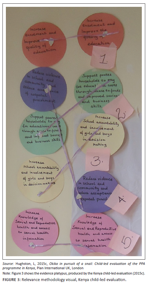 The OCED DAC evaluation criteria, while clear, are abstract concepts that children (and probably adults) were not familiar with. To facilitate their understanding, we created a visual representation to illustrate each criterion. For example, to assess relevance, the programme's sectors of intervention, were written on coloured cards, then were ranked in order of importance by both the Plan staff and the evaluation's respondents. The two sets of cards were then laid out side by side, in order of priority, for the programme and for the respondents. The CEs were then tasked to use ribbons to link each sector on one side with the matching sector on the other. The length of ribbon needed was used to reflect on the relevance of the activities. (Figure 3). A short length of ribbon would indicate that the programme and the communities assigned a similar level of importance to those activities, while a longer length would suggest the programme had not aligned its priorities with those of the communities.6