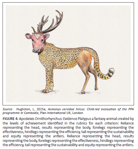 Criterion by criterion, the data were analysed and debated by the CEs, who were then asked to select the level of achievement justified by the evidence in a series of purposefully created rubrics. Each level of achievement in the rubrics was assigned an animal rather than a number, fearing that the CEs might avoid ascribing a low level of achievement, based on their experiences of grading at school.7 Hence, the evaluation of each criterion produced an animal as score, corresponding to a description of achievement in a rubric. The combination of the different animals, one for each criterion, was then used to create a fantasy animal summarising the entire evaluation (see Figure 4). The head representing relevance, the front legs for efficiency, the tail that of sustainability and so on. In our experience, all CEs were able to equally participate in this process, irrespective of age and gender. In fact, we observed several passionate debates among CEs over these conclusions, challenging each other on the basis of the evidence they had collected. However, we should note that at this point in the process, the CEs had already spent several days together and had formed a team spirit. We cannot be sure that in a much shorter process,8 individual traits such as shyness or gender norms might impair their willingness to engage in such debates.