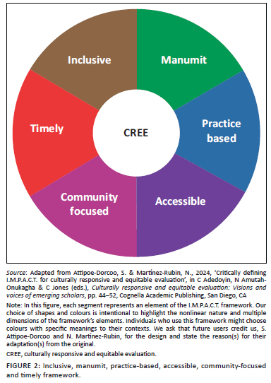 Against this professional environment as a backdrop, Black, Latine and Native American evaluators have called for, and written about approaches to evaluation that resonate with each other despite varied ancestral backgrounds that have influenced evaluation practice (Attipoe-Dorcoo & Martínez-Rubin 2024). These approaches, based on CREE principles (culture, response, equity and evaluation, Figure 1), give resounding acknowledgement to the uniqueness and value of racial and ethnic cultures. Culturally responsive and equitable evaluation-oriented evaluation highlights the necessity for the evaluation field to modify and reframe long-established and Western-based evaluation designs, which have treated evaluation study participants primarily as external information sources to be observed, studied and examined. Culturally responsive and equitable evaluation orientations to evaluation instead give high regard to study participants' dissimilar and extraordinary life circumstances and accept that those circumstances, rather than the evaluation, would be of prime concern to those study participants. As critical thinkers, we espouse collective action towards addressing systemic oppression, be that in the US or international settings. For example, Evolving Evaluation is a 2-year research effort by Expanding the Bench®, an initiative committed to diversifying evaluation and elevating CREE. This research study engaged evaluators in critical reflections on their own journeys, stories and experiences with evaluation in their practice of CREE. Among the study findings were: 'Evaluators of color blend their lived experiences of racial oppression with self-reflection around other intersections and privileges'. The study also found: 'For evaluation practice to advance, evaluators have had to unlearn what they were taught and dismantle early evaluation teachings around concepts of objectivity, validity, and rigor' (Silva et al. 2023). These diverse evaluators include those with connections to Africa, either as African-born, have ancestry to the continent or currently have established evaluation practices in the African diaspora, and see the need for contextual Africa-led evaluations that intersect indigeneity and CREE.