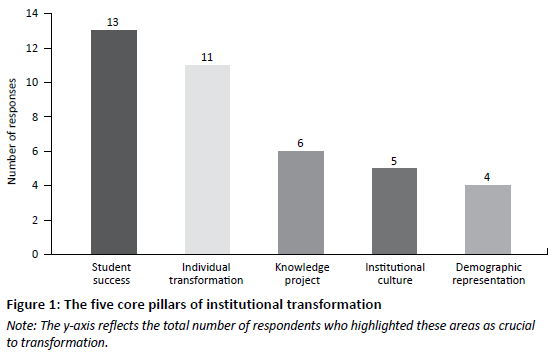 As seen in Figure 1, student success was regarded as the most important of the five pillars. The interviewees stated that a key indicator of the success of higher education transformation is the extent to which students have succeeded. To date, student success, measured as the number of students awarded degrees, remains racially skewed. This raises questions around effective teaching and learning strategies for a diverse student body, as well as the viability of the curriculum structure and content. The participants raised concerns about the imbalance between investments in research and in optimising teaching and learning strategies to enhance throughput. Greater in-depth qualitative work is needed to understand a curriculum's impacts and its relationship to effective strategies for teaching, learning, and assessment, since these are fundamental areas of transformation that must be adapted to promote excellence and equity.