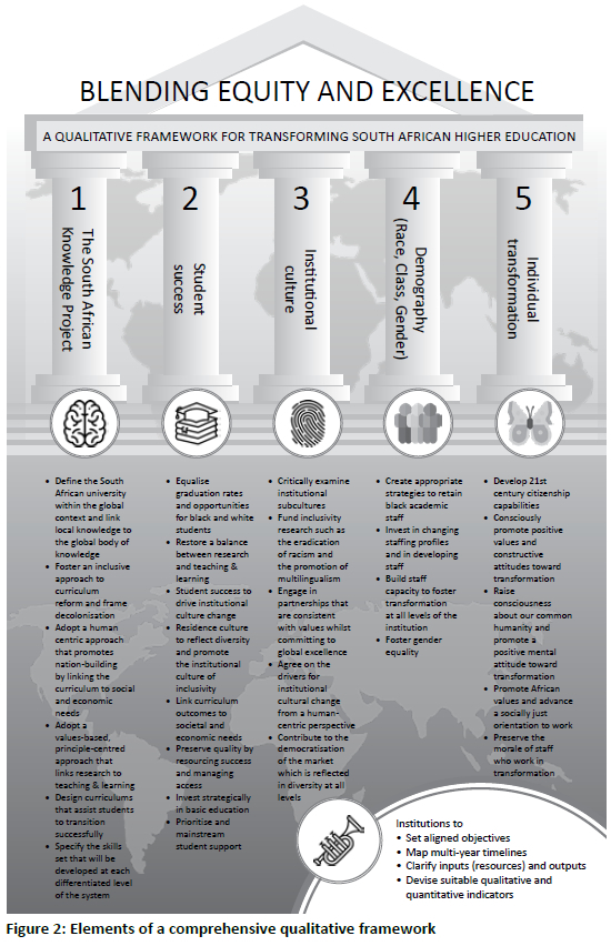At the start of this process, there were intensive debates about the trajectory of the transformation of higher education. I position this debate in a theoretical conceptualisation based in human capital theory (Organisation for Economic Co-operation and Development [OECD], 2013) and human capabilities theory (Nussbaum, 1997; Sen, 1999). The former champions 'education for the market', and the latter 'education for human flourishing'. Both have implications for understanding the role of higher education in society. The study presents five key pillars for institutional transformation, which together make up a framework for transformation that reconciles excellence and equity (Badat, 2016; Wolpe, 1995), opening up the discussion on the role of student affairs in the broader higher education transformation project. I argue that when there is collaboration between student affairs and other stakeholders, new opportunities arise to reconcile equity and excellence, shedding light on how they are interconnected. Student affairs practitioners and researchers can actively shape a learning environment and can be instrumental in leveraging the five pillars of transformation for student success.
