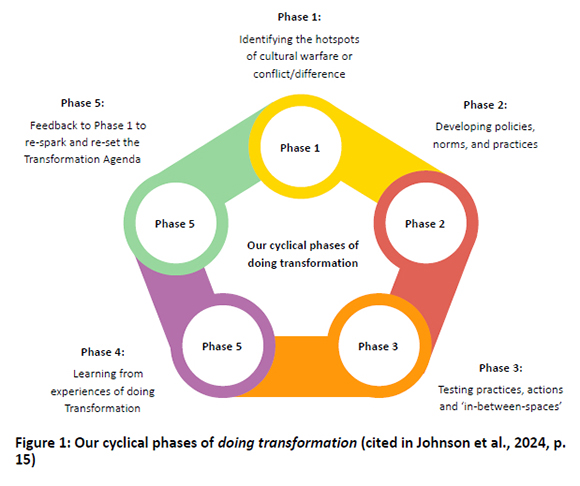 The joy in this work is that there are various ways and avenues to engage and catalyse change. We use a rhizome-like change theory in the work we do at Wits University, where we engage with context-informed change in a cyclical manner, from identifying sparks or hotspots of change, which emerge at any point and space, to learning about and enhancing our practices of change (Johnson et al., 2024, p. 14). Figure 1 below provides a description of our cyclical phases of doing transformation.