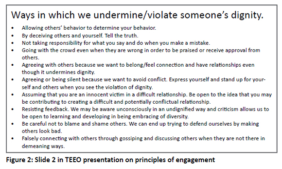 This slide powerfully resonates with colleagues, students, and stakeholders as ways in which dignity is undermined. Often people can identify, for example, how they go with the flow, are afraid to go against what most people say, end up presenting themselves as victims and turning to corridor talk as ways of coping with leaders' inability to listen or for them to feel heard. The formation of in and out groups, cabals, factions is powerful, and they can form fast in spaces as ways for people to find new sources of power. As these ways of undermining dignity are replicated, cultural practices are formed over time in the higher education sector. I have received, for example, bullying cases where a situation has festered for 2 years, 4 years and even up to 10 years. But they usually all start off with these subtle ways of undermining dignity.