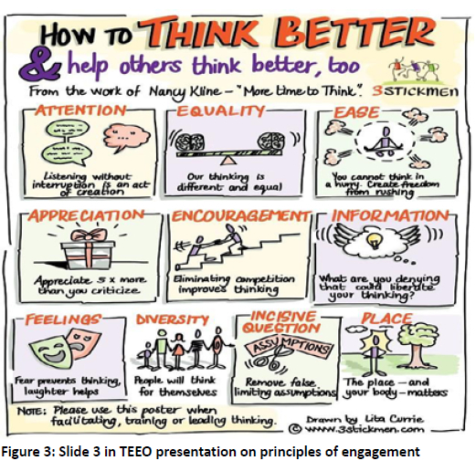 Through her 10 components of creating a thinking environment, Nancy Kline offers us a way of helping ourselves to think and be heard. I have drawn on the slide that follows to capture her 10 components to develop an awareness of what is needed to help us think and do deep transformative work with multiple and diverse stakeholders and settings.