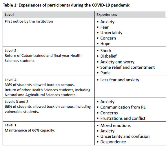 As expected, there was fear, shock, disbelief, and panic during the different lockdown levels. The first group of students allowed back on campus during level 5 comprised of all final-year Health Sciences students, including 52 medical students who were trained in Cuba but had to return to South Africa to complete their final year of study and be integrated into the South African health care system. There was panic, especially in receiving the Cuban-trained students, as revealed by one participant: "What am I going to do with these 52 people?"; and disbelief: "Is this really happening?"