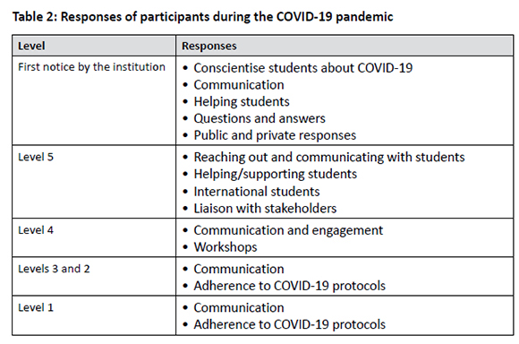 Table 2 shows that participants regarded communication as the most important response during all levels. Although this presented as a novel situation to everybody, after the institution's announcement, the residence heads had to respond appropriately and correctly to various questions from students. One participant said: "I told them about the seriousness of the pandemic and [that] at that stage we need to consider their safety first." It was important to rely on official communication and take advice from the National Institute of Communicable Diseases (NICD) and Higher Health, to allay anxieties and fears. One participant referred to the public versus private response: "we react publicly in front of students, where we always have to be a source of direction with positive vibes, but I was, joh!, going through a moment at the same time anxious"