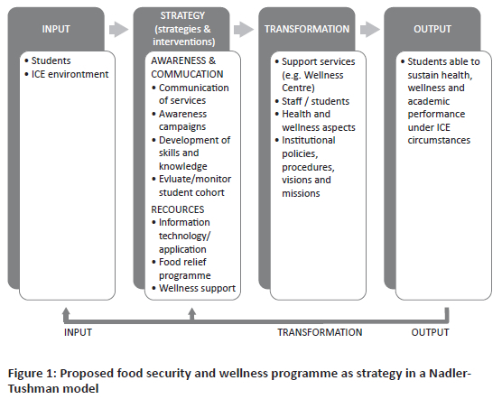 The health and wellness aspects (culture/informal process) referred to the areas that were investigated in the current study and include: food security, dietary intake, general health, weight management, physical fitness, and mental well-being. As is evident from the literature, these aspects are interconnected and should be in synergy to ensure optimal health (Kruger, 2019). For example, food insecurity results in poor mental health, as was evident in the findings. Similarly, good mental health can foster poor dietary habits like binge eating. Therefore, when these aspects of health and wellness are in synergy - unlike in the current study's findings - they can help individuals achieve optimal health and well-being, the output. The institutional regulatory code is imperative in the transformation process (Figure 2); however, this study did not examine the institution's existing code. Instead, the proposed recommendations are grounded solely in the empirical findings. Hence, it is suggested that the institution review its regulatory code against the proposed transformation model to identify if the relevant code is sufficient to obtain the desired output.