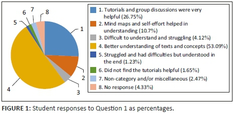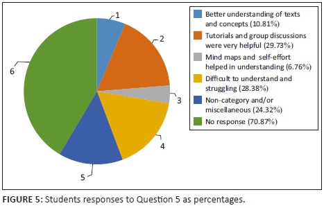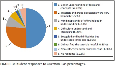 A similar trend was found in the responses to Questions 2, 3 and 4. In the responses to Question 2, ('Comment on and explain how the tutorials and the role-play reading activities assisted you in understanding sociology concepts'), 90% of the students responded positively. In addition, more than half of the respondents reported that the tutorials helped to develop their understanding of texts. Some students said that the tutorials helped them put sociology concepts into their own words, which allowed them to grasp the meaning easily and helped them to remember the concepts better. Others also indicated that the group discussions meant that others offered examples of how the concepts worked in real life, which helped facilitate a deeper understanding of the concepts. A student who indicated that she was still struggling reported that, while the readings still seemed difficult, if she applied what had been taught in tutorials, she felt that she would have found it easier to engage with the concepts and the reading of the texts.