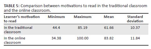 Table 5 reflects that learners' motivation to read in the traditional classroom produced a mean score of 61.66 with a SD of 10.37. On the other hand, learners' motivation to read in the online classroom produced a higher average score of 83.82 and a corresponding higher SD value of 11.84. Considering these figures, learners in the online classroom reflected a higher motivation to read than those in the traditional classroom setting.