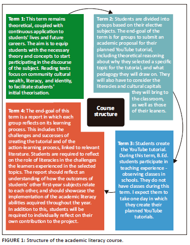 The action-learning project around which the pertinent curriculum was centred, worked as follows: in groups of approximately four, students were required to plan for (in the form of a proposal) and create a YouTube tutorial on a topic in one of their major teaching subjects (for example mathematics, science, life orientation, isiZulu or English), aimed at South African high school learners1. Figure 1 indicates how the course was structured from Term 1 to Term 4. As illustrated in Figure 1, the proposal was the assessment artefact used to assess students' understanding of literacy-related concepts at the end of the second term of their studies, and their application of academic literacy competencies, as discussed earlier in this section. Term 4 took the form of a reflection report: during this term, students were guided to reflect on various aspects of the action-learning project, while simultaneously applying all the academic literacy competencies that had been introduced throughout the year. The course purposefully moved away from assessing by means of the traditional academic essay for two reasons: firstly, assessment in higher education increasingly favours a genre approach according to which students are required to write across a range of the genres in which they are likely to come across later in their studies and beyond. Secondly, both genres (namely the proposal and reflective report) drawn on, still require skills similar to those needed in essay writing, including writing effective introductions and conclusions, writing coherent and well-argued paragraphs, synthesising information, and integrating secondary literature (related to core course concepts, but also to justify various pedagogical choices in their proposals and support statements in their reflections).