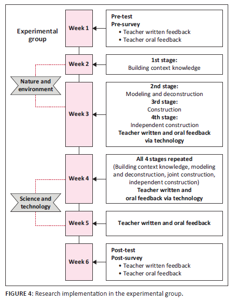 The experimental group during the research's initiation underwent an initial assessment and survey in the first week, forming the foundation for subsequent investigations. Quantitative data were collected consistently from week 1 to week 6. Following this preliminary phase, educational sessions unfolded from week 2 to week 5, encompassing four weeks of instructional activities. In the sixth week, assessments and surveys were administered to evaluate the impact of the instructional intervention. Furthermore, qualitative interviews were conducted with students post assessment to glean nuanced insights.