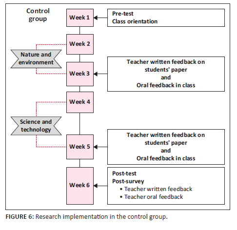Importantly, both groups received feedback encompassing both corrective and content-focused aspects during the course of the study. This feedback was integral to evaluating the efficacy of their respective instructional methods. Ultimately, post-tests were administered to both groups in the final week to assess the impact and effectiveness of the instructional interventions. Figure 6 provides a visual representation of the research methodology applied within the control group.