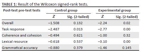 The first research question investigated learning outcome disparities in THE between a control group following a conventional lesson plan, and an experimental group incorporating technology-mediated teacher-written and oral feedback within the process-genre approach. A Wilcoxon signed-rank test was used to analyse pre-test and post-test scores, considering task response, coherence and cohesion, lexical resource, and grammatical range and accuracy criteria in both assessments. The significance was set at p < 0.05.