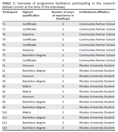 Purposive sampling was used for this study as the researchers wanted to ensure the inclusion of specific individuals and groups who could provide critical insights (Lavrakas 2008) into the role that the BuddingQ programme could play in Grade R learners' literacy and motor development. The participants included 13 programme facilitators (n = 13) and eight Grade R teachers (n = 8), all of whom were actively involved in the programme within the Makhanda region, and who voluntarily consented to participate (Table 2).