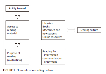 Therefore, the three elements of a reading culture are, in the first place, the ability to read; secondly, having access to reading material (cf. Figure 1), whether digital or in print; and thirdly, a motivation to read, which is premised on the ability to do so and having access to various forms of reading material, which are accessed for a wide variety of reasons, or with a variety of intentions (cf. Figure 1). The purpose of reading can involve reading for information, reading for communication, and reading for enjoyment. Only once all three elements are evident, a reading culture is established.