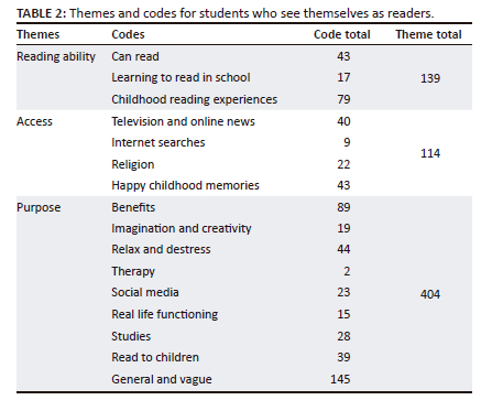 More than half of the total number of coded responses of those students who considered themselves readers pertain to the third theme, namely, a purpose for reading. Eighty-nine students offered the general benefits of reading as a motivation for why they saw themselves as readers, while 19 referred to creativity and imagination specifically. Forty-four students indicated that reading helped them to relax and destress, while two mentioned that reading was a form of therapy.