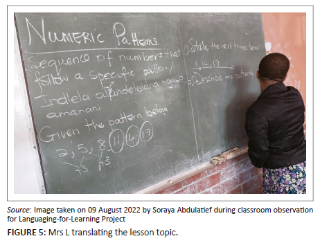 In Figure 5, we see an example of Mrs L writing the focus of the lesson first in English, 'Sequencing of numbers in a specific pattern', and then translating it to isiXhosa, 'Indlela alandelelana ngawo amanani'. Unlike existing language ideologies and language hierarchies that pit learning in an African language against learning in English, Mrs L demonstrates that both languages can be used in tandem rather than in competition to support learning. In this act of translation, Mrs L legitimises the learners' home language as well as her own, provides access to knowledge in their home language and normalises bilingual meaning-making through making it visible.