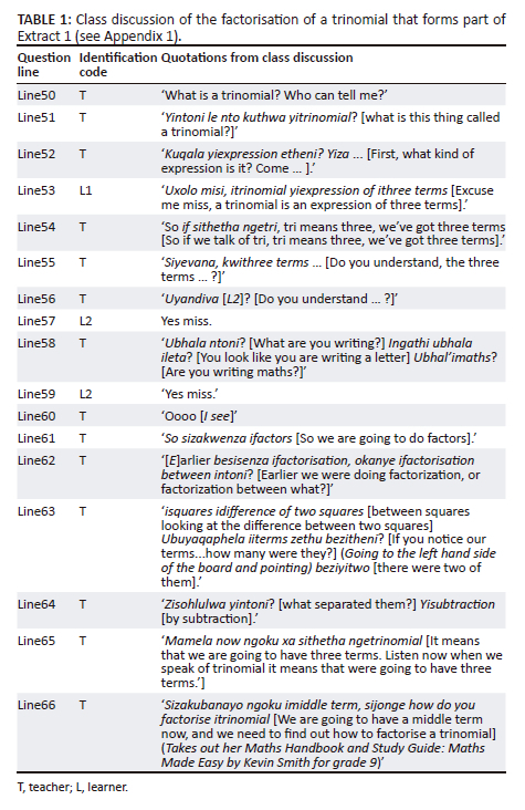 In Table 1, Mrs L is named as 'T', denoting teacher, and the learners are denoted as 'L'. Mrs L and the learners use English, isiXhosa, and a mixed or meshed register of English and isiXhosa. Thus, they use a hybrid repertoire that transcends the two named languages often seen as separate and bounded. The transcript (indicated in Table 1 as Line) demonstrates that the communication practices of bilingual and multilingual speakers are very different to those of monolinguals. This translingual practice which combines resources of isiXhosa and English is often rejected or undermined by those having a monolingual orientation to language and yet it is the norm for multilingual speakers. Mrs L starts the revision lesson on trinomials by writing, 'Factorisation of a trinomial' in English on the board followed by the is iXhosa translation.