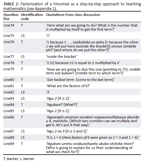 In Table 2, we can see the step-by-step approach Mrs L takes and her use of joint construction with the learners to ensure that they understand factorisation. As Mrs L continues with the lesson, she uses English, asking: