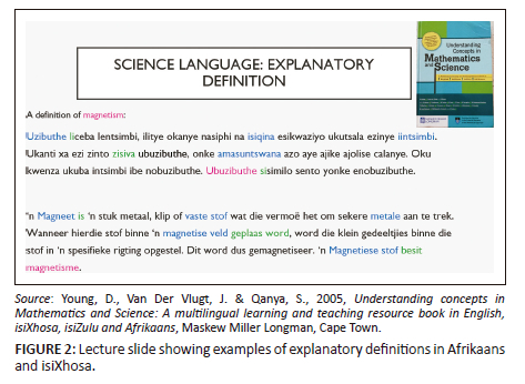 Project 1 was based in the third year of the 4-year Bachelor of Education course at a Western Cape university. The first phase of the project consisted of a 6-week online teaching unit delivered to 80 natural science methodology students in 2021 on topics such as oral and written translanguaging, science terminology in different languages and language policy. The second phase involved lecturers visiting students at school during their teaching practice period in their fourth year of studies. In Phase 1, the lecturers on the multilingual science methodology course (including Tyler) shared multilingual resources with the students such as worksheets, glossaries, dictionaries, and tests. Figure 1 and Figure 2 are examples of PowerPoint slides used in the lectures.