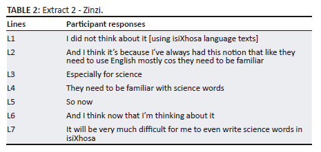 Prior to Extract 1, the interviewer asked whether they thought of using any of the multilingual or isiXhosa language text resources they were exposed to in lectures or making written bilingual resources themselves. All three student-teachers reported that they had not used materials in a language other than English. They explain further in the extracts that follow: