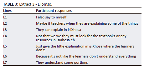 Lilomso expresses a discourse of minimalism and concession related to the use of isiXhosa in oral explanations. In Line 5 (Table 3), she prefers a 'little explanation in isiXhosa' indicating that only oral isiXhosa should be used sparingly to ameliorate the lack of understanding in her students, 'where the learners don't [understand]'. Here she echoes another teacher who referred to 'smuggling in the vernacular' in her classroom (Probyn 2009) - words that reveal a belief that isiXhosa is illegitimate in the class and should be used as little as possible. Apart from its minimal use orally, Lilomso rules out using isiXhosa in the authoritative written form: 'not that we […] must look for the textbooks or any resources in isiXhosa'.