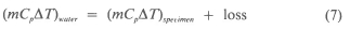 The loss is the heat transfer between the water and the inner glass container of the thermoflask. If the quantity (mCp∆T)water is plotted as the ordinate and (m∆T)spedmen is plotted as the abscissa, then from eq (7) a straight line should be obtained with a slope of Cp (if Cp is a constant) and intercept 'loss'. Thus, Cp was determined from the slope of the (mCp∆T)waler vs. (m∆T)specimen curve over the range of temperatures where it was a constant. Data were taken for the temperature range of - 70 °C to 70 °C.
