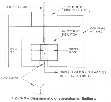 To decrease the thermocouple conduction error, the portion of the thermocouple wires that were not embedded in the specimen were insulated. This reduced the heat exchange between the thermocouple wires and the ambient. This heat exchange leads to higher temperature readings when the specimen temperature is below ambient and to lower temperature readings when the specimen temperature is above ambient temperature. As a check measure, tests were performed using acrylic, copper and aluminum specimens. The values obtained were 8.5 χ 10-5 °C for acrylic, 1.74 χ 10-5 °C for copper and 2.41 χ 10-5 °C-1 for aluminum. These results compare within 6 per cent of the published values in standard handbooks.