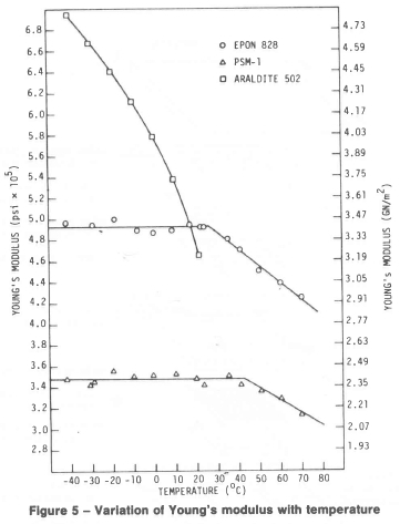 For two of the materials, Young's modulus did not show much variation at temperatures lower than room temperature. It started to drop, however, at higher temperatures. This general trend was observed in both Epon 828 and PSM-1 (Fig. 5).